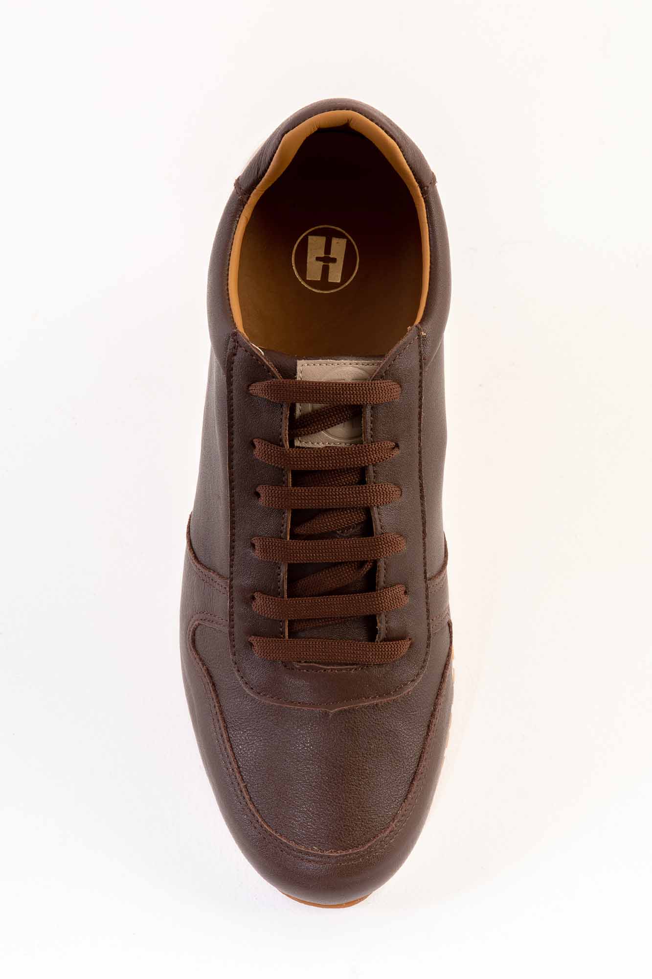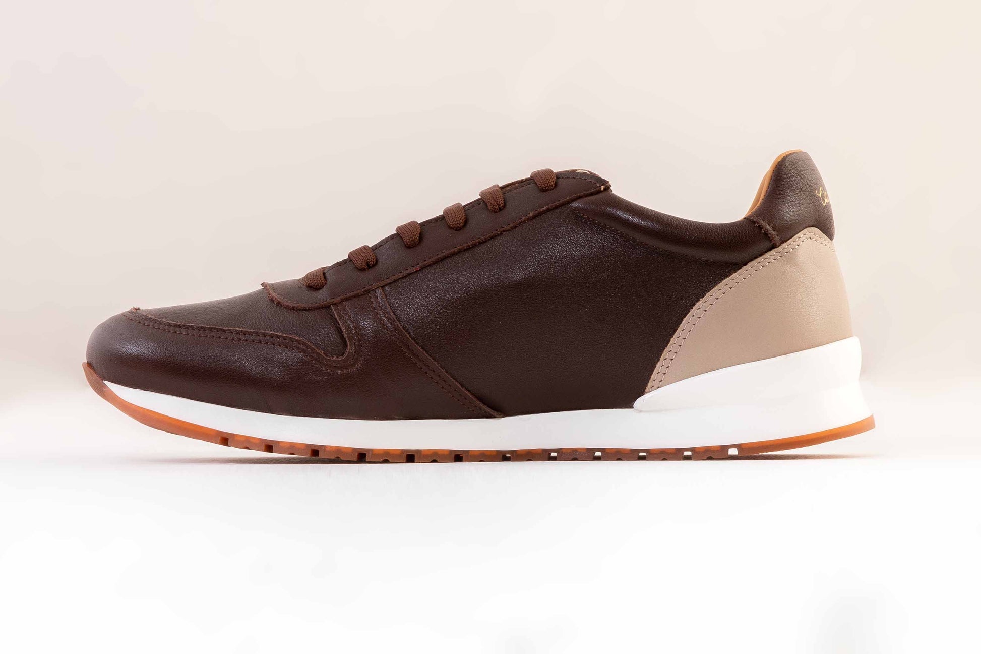 Nuestro modelo TIM presenta un estilo de sneaker deportiva a la vez que elegante. Están hechos a mano con piel vacuno acabado en color tabaco con el detalle del talón en color taupe. Nuestras elegantes letras del logo en tono dorado se destacan en el collarín del talón y nuestro logo, estampado en el parche de la lengüeta.