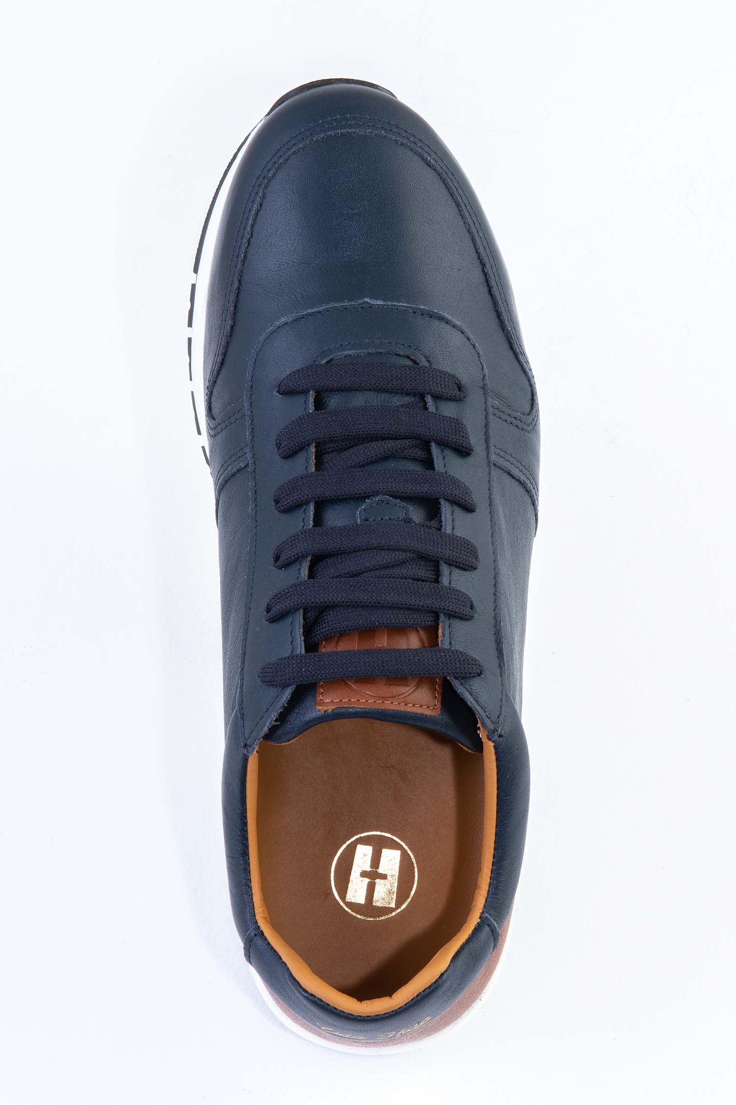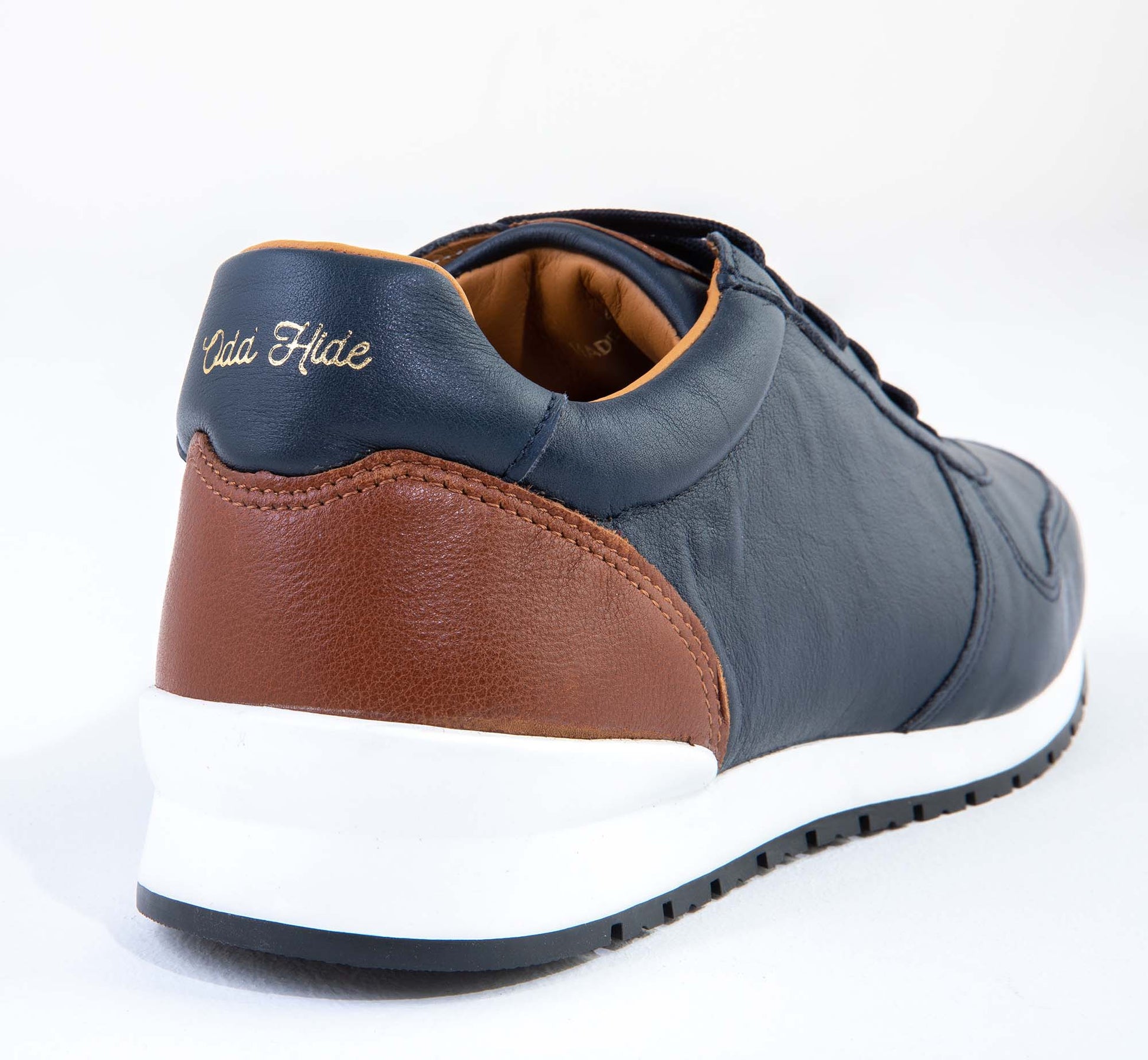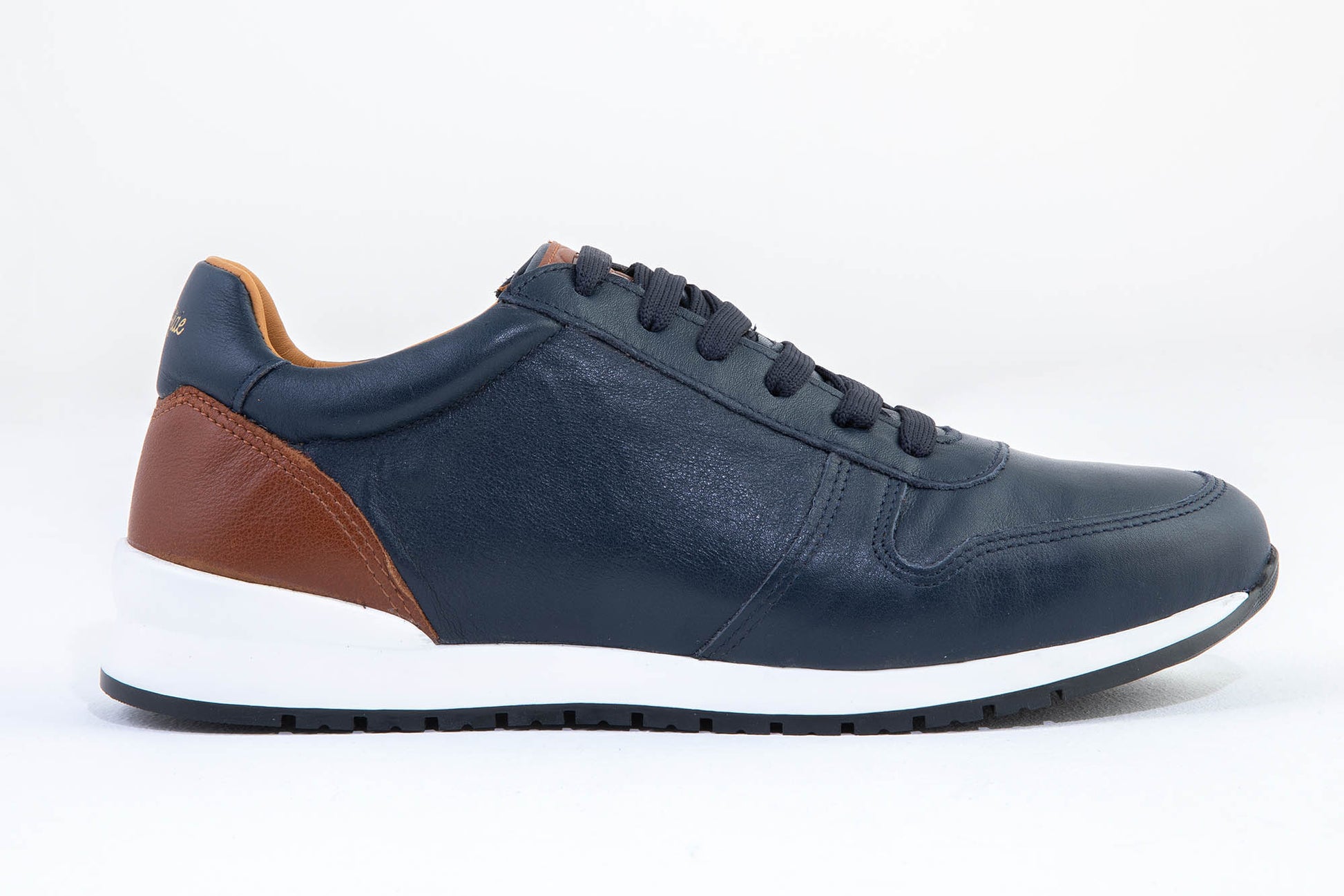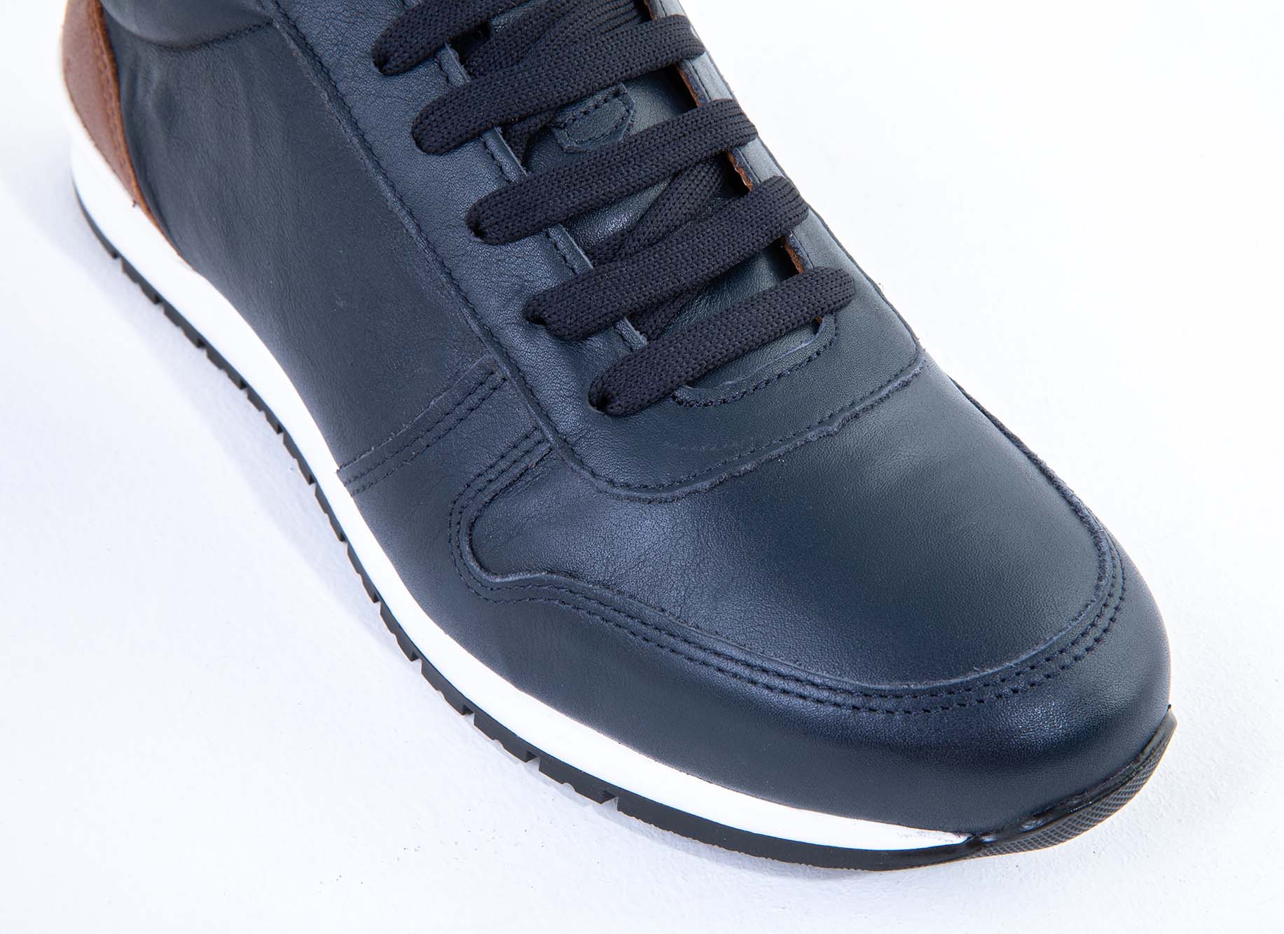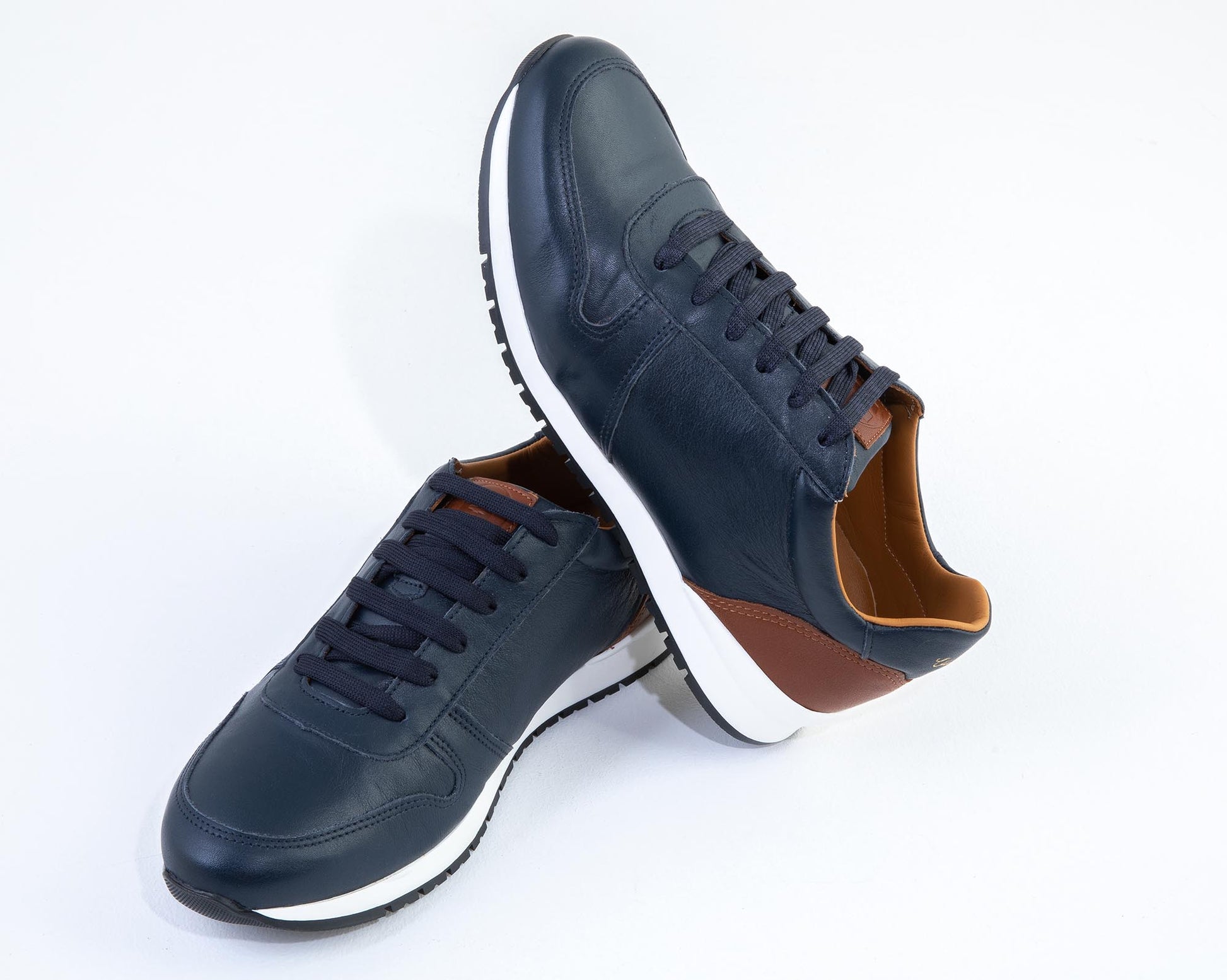 Nuestro modelo TIM presenta un estilo de sneaker deportiva a la vez que elegante. Están hechos a mano con piel vacuno acabado en color marino con el detalle del talón en color cuero. Nuestras elegantes letras del logo en tono dorado se destacan en el collarín del talón y nuestro logo, estampado en el parche de la lengüeta.