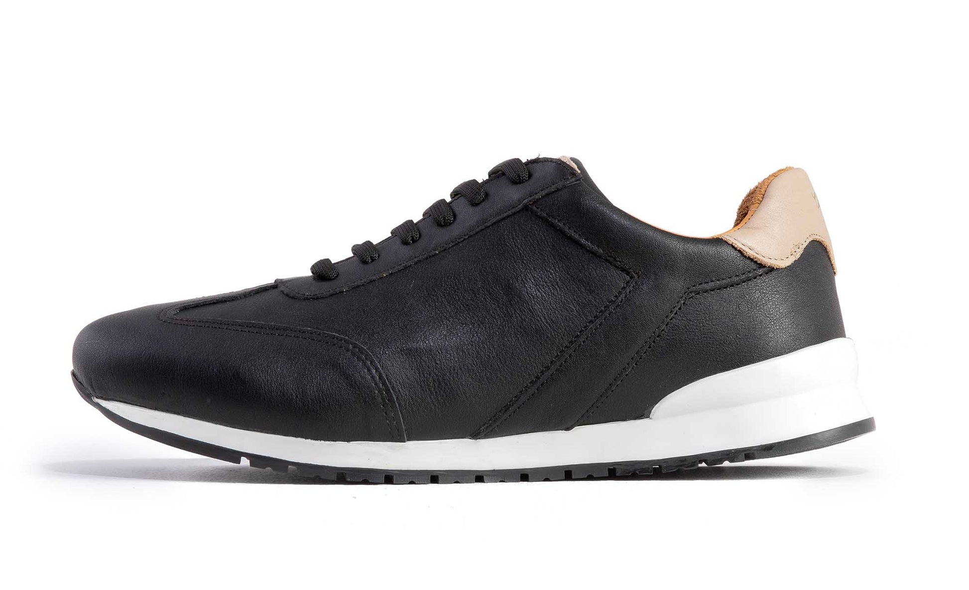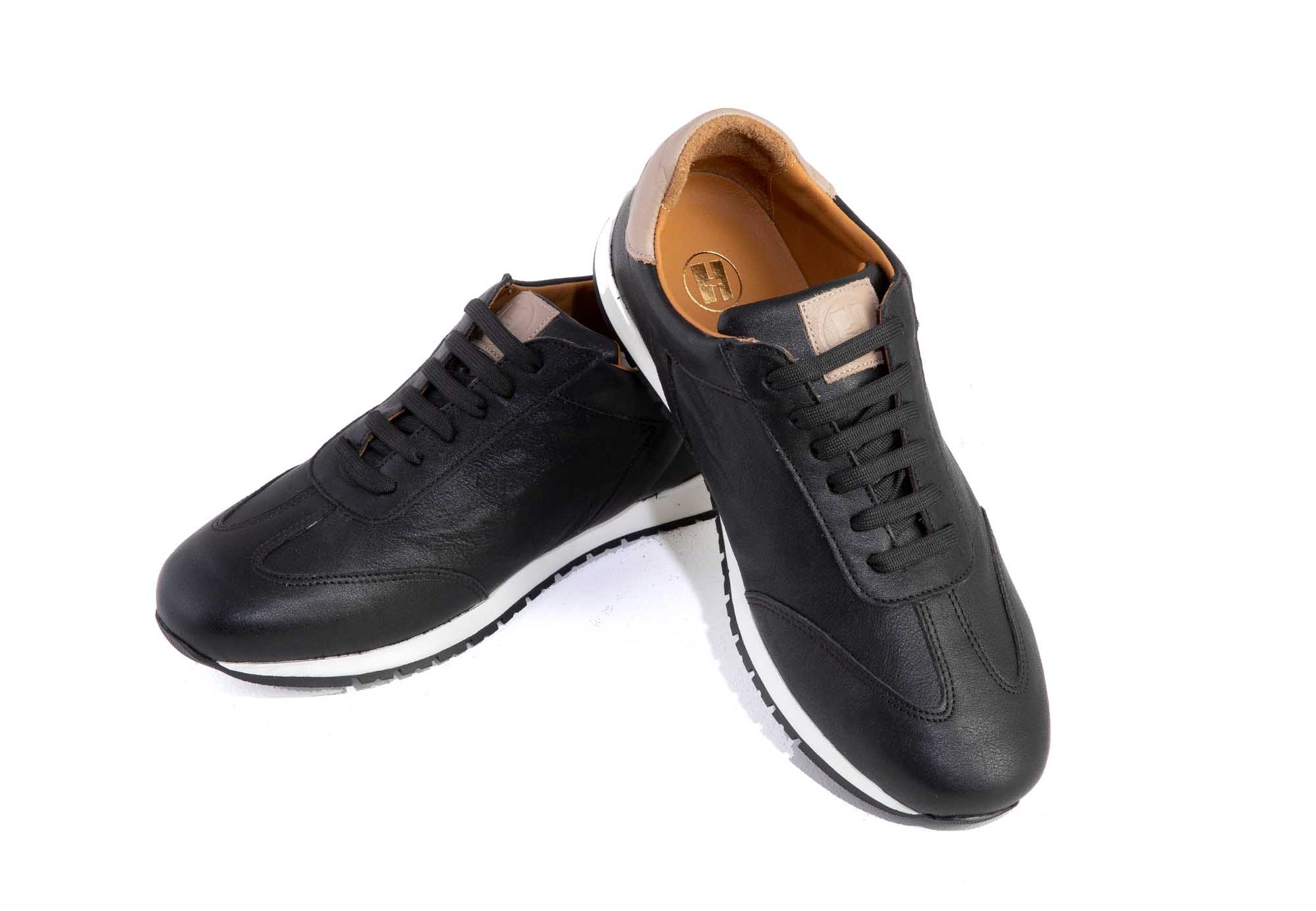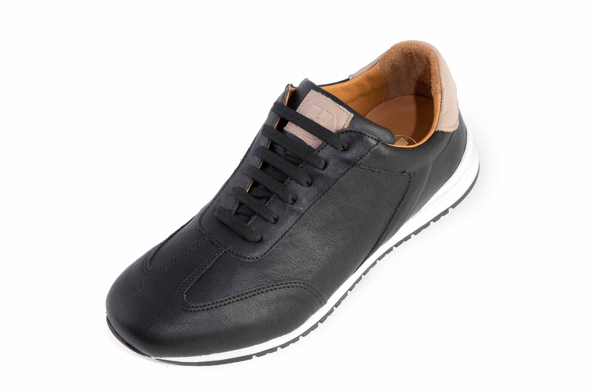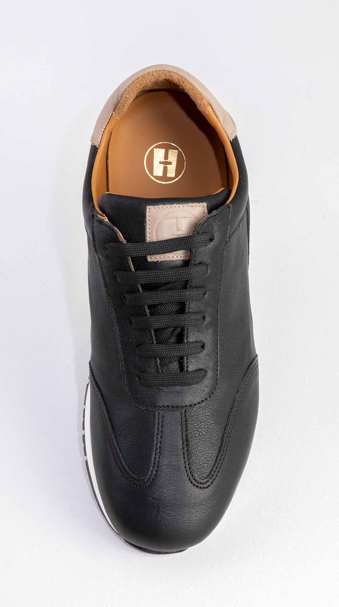 Nuestras zapatillas TOM, hechas a mano, presentan un estilo de sneaker urbano y cómodo. Están hechos a mano con piel vacuno acabado en color negro con el detalle del collarín del talón en color taupe. Nuestras elegantes letras del logo en tono dorado se destacan en el collarín y nuestro logo estampado en el parche de la lengüeta.
