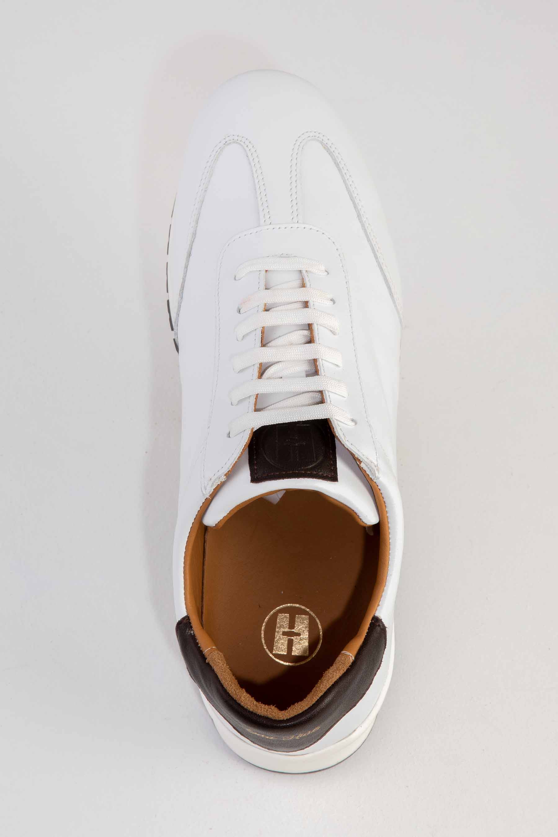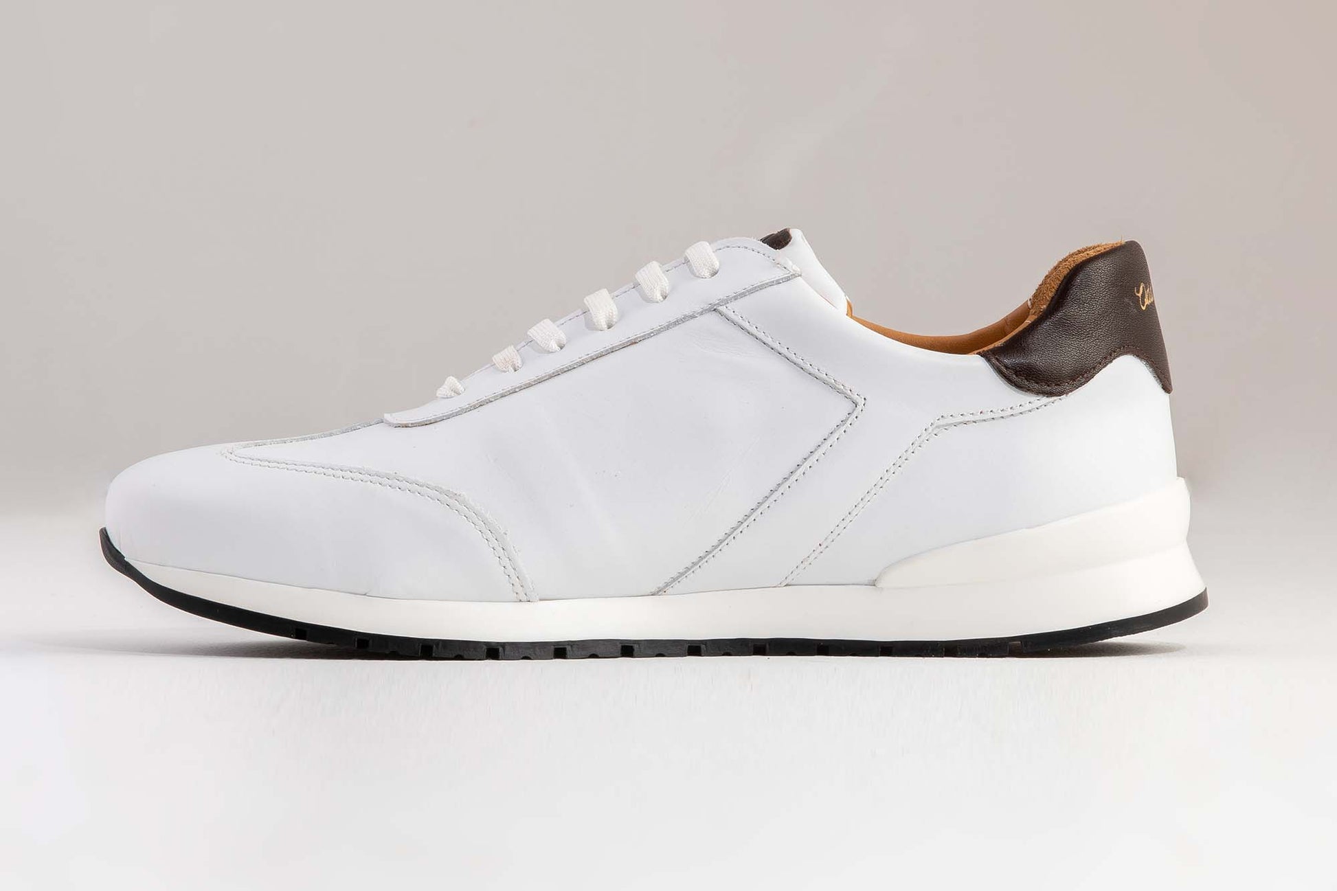 Nuestras zapatillas TOM, hechas a mano, presentan un estilo de sneaker urbano y cómodo. Están hechos a mano con piel vacuno acabado en blanco con el detalle del collarín del talón en color marrón oscuro. Nuestras elegantes letras del logo en tono dorado se destacan en el collarín y nuestro logo estampado en el parche de la lengüeta.